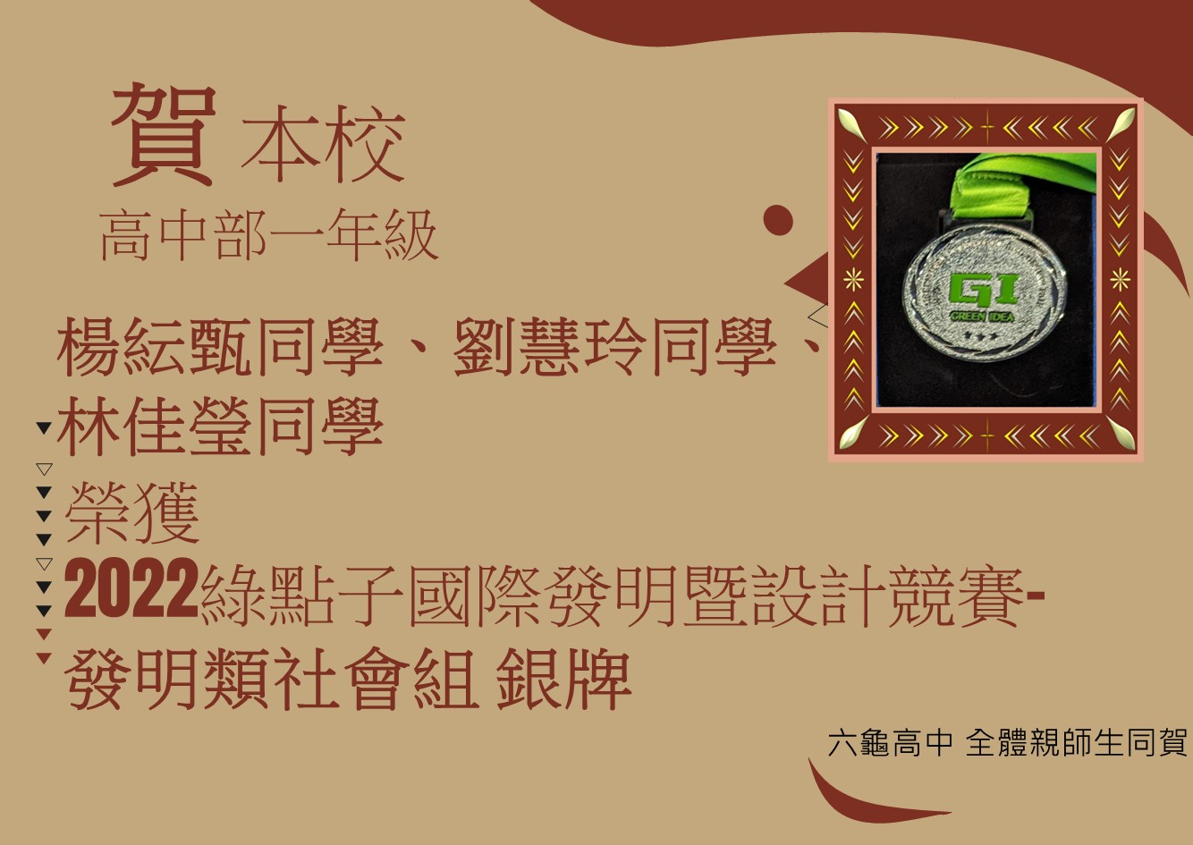主題:賀本校高中部一年級楊紜甄、劉慧玲、林佳瑩榮獲2022綠點子國際發明暨設計競賽發明類社會組銀牌