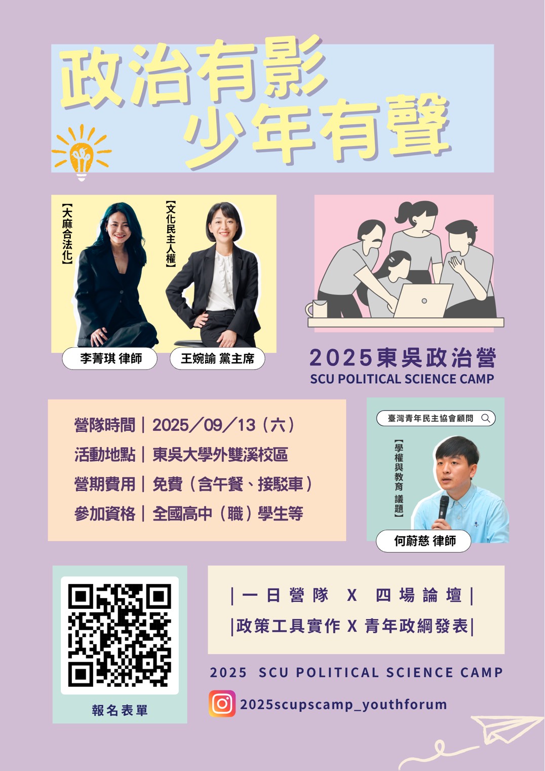 | 東吳大學政治系114學年度「 2025東吳政治營-政治有影,少年有聲」營隊活動 | 學務處 | 2025-08-07 | 2025-08-16 | 21 | 附件 |