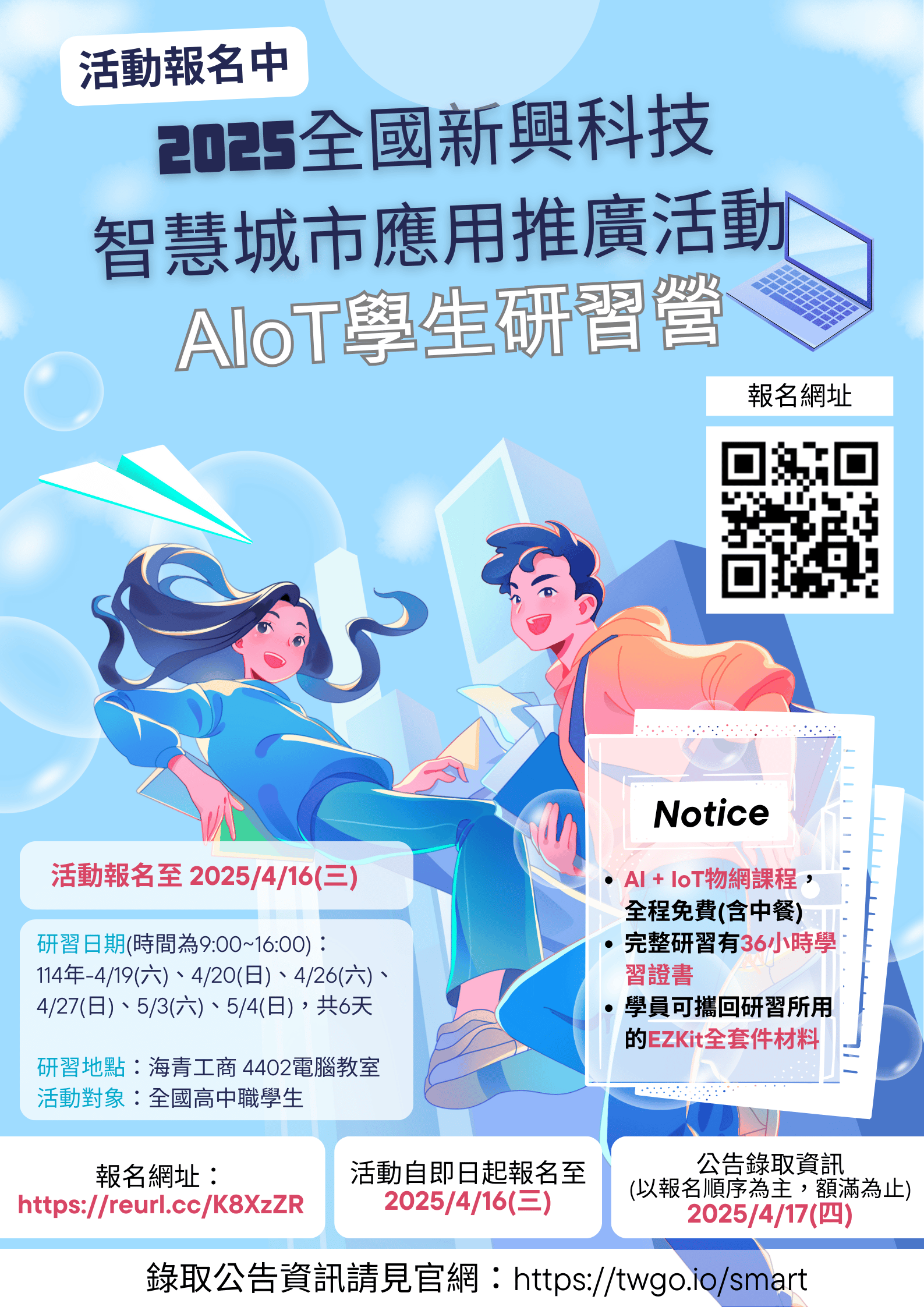 | 2025全國新興科技智慧城市應用推廣活動-AIoT學生研習營 | 教務處 | 2025-04-16 | 2025-04-19 | 31 | 附件 |