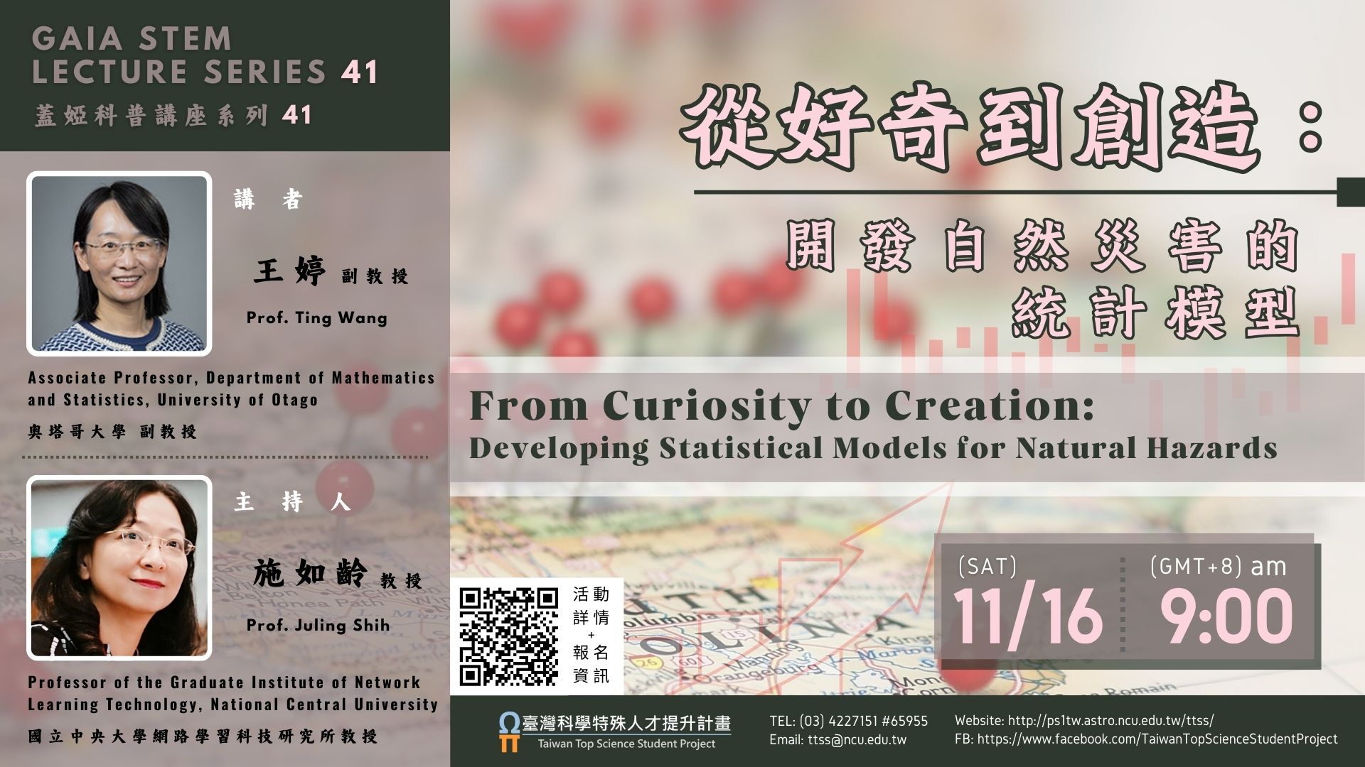 | 113年11月16日線上講座:《蓋婭科普講座系列 41》—— 「從好奇到創造:開發自然災害的統計模型」 | 教務處 | 2024-10-24 | 2024-11-17 | 45 | 附件 |