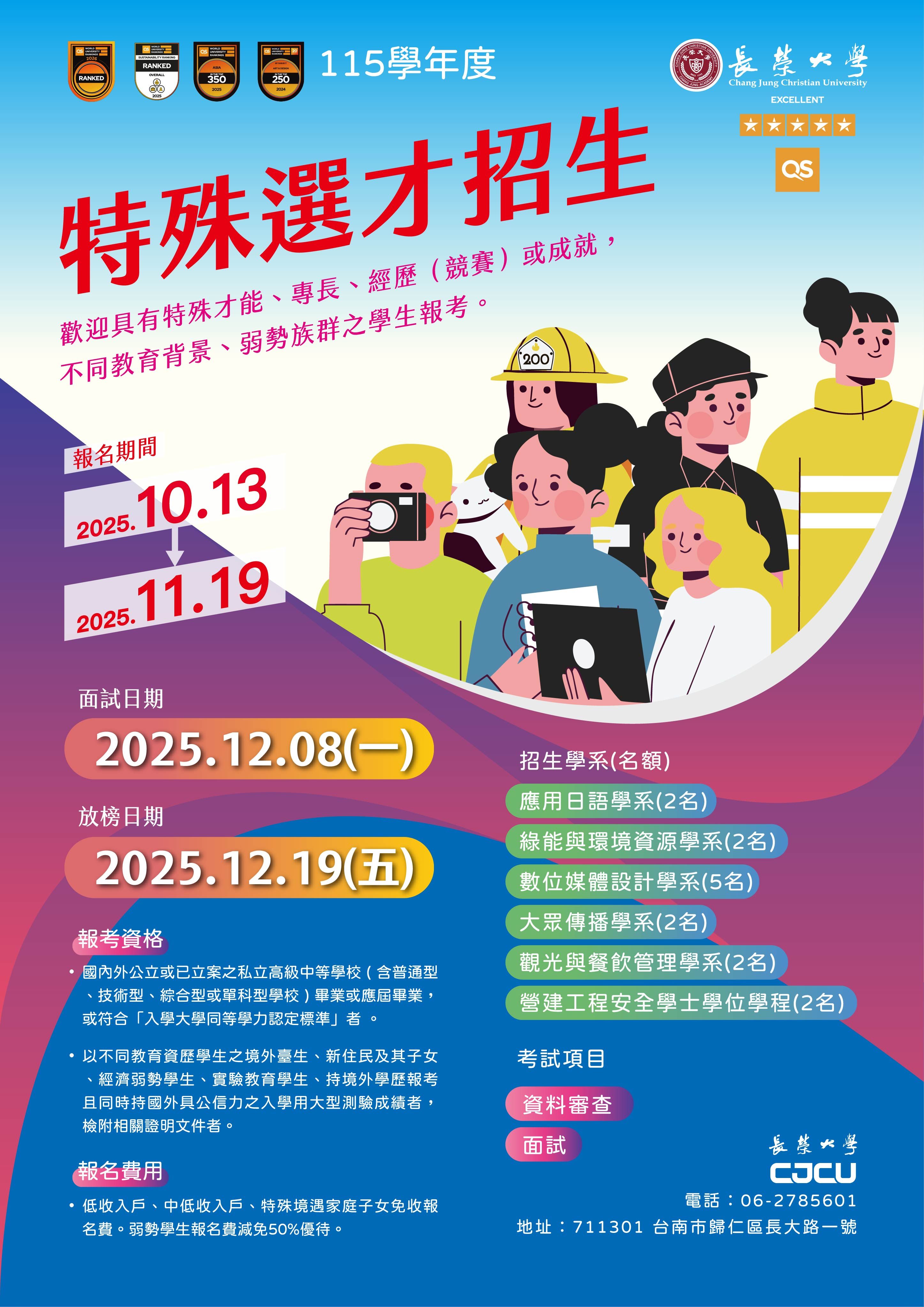 | 長榮大學115學年度辦理特殊選才招生資訊 | |