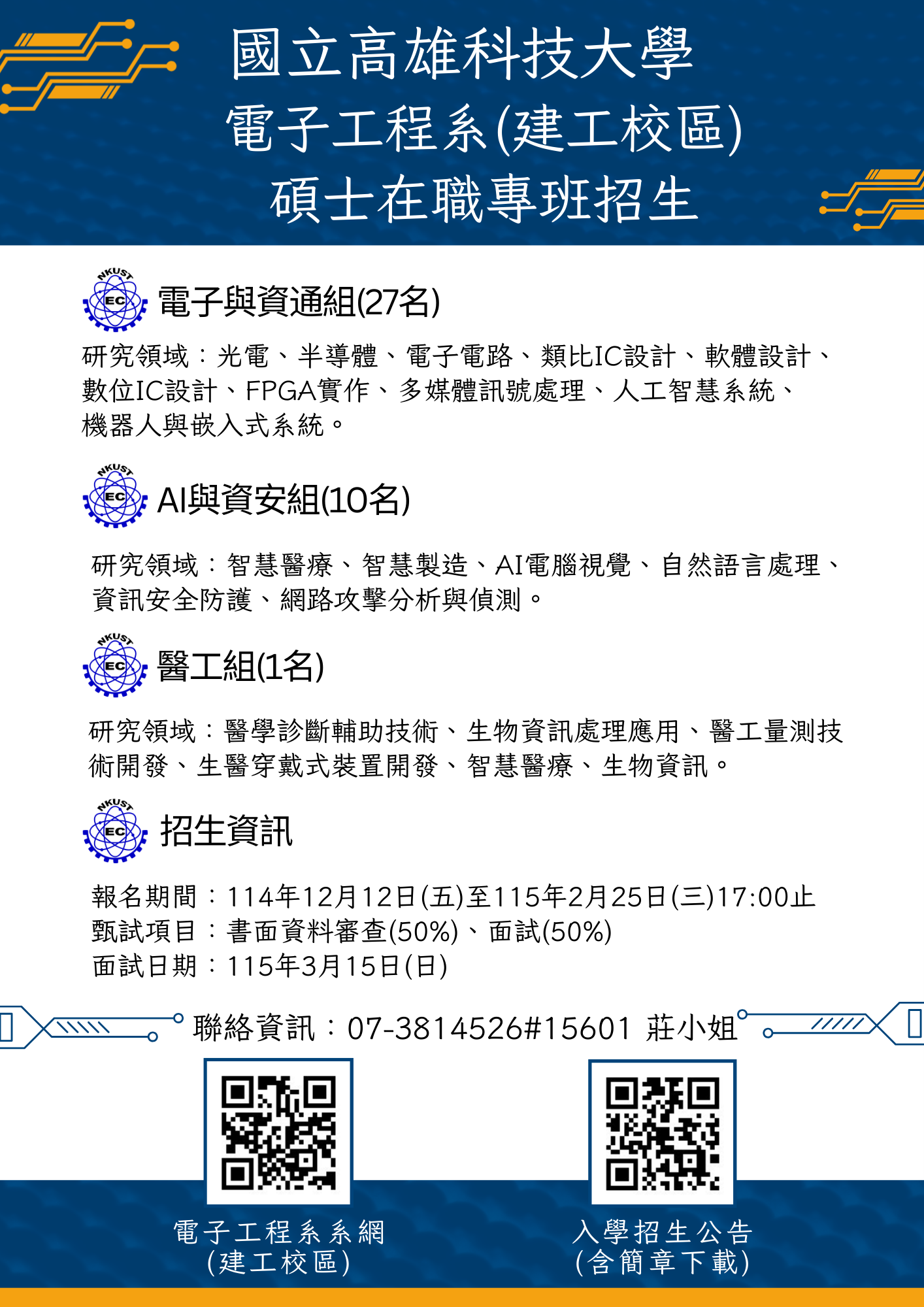 | 國立高雄科技大學電子工程系(建工校區)115學年度碩士在職專班入學招生資訊 | |