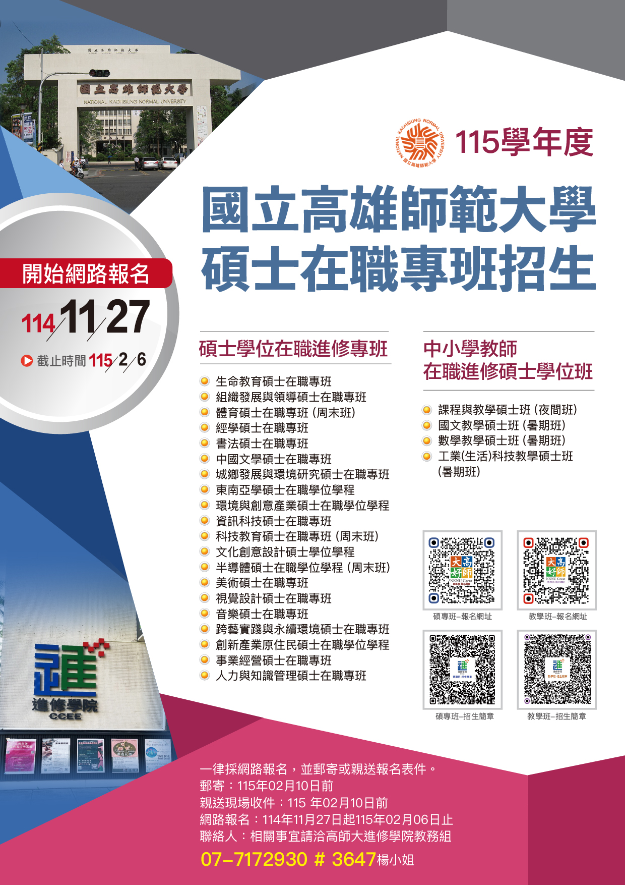 | 國立高雄師範大學115學年度「中小學教師在職進修碩士學位班」招生資訊 | |